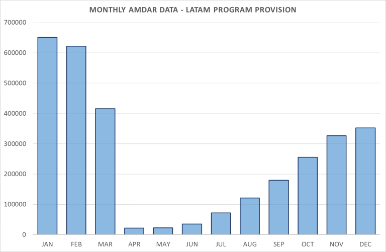 As mentioned, AR-AMDAR has reported a very pronounced decrease and ultimate stoppage in its AMDAR data provision (fig 1.).  The COVID-19 pandemic forced the LATAM Argentina branch into bankruptcy and ended the regular AMDAR data provision from this country after June 2020.