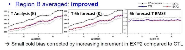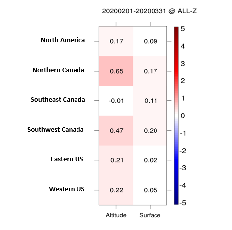 Figure 2 presents a summary of the averaged relative change in root-mean-square error (RMSE) calculated for the 48-hr forecasts and for all variables together over different domains.  The relative change in RMSE defines the improvement where positive (red) values represent improved forecasts with respect to the control experiment. The forecasts are evaluated against wind and temperature observations from aircraft and radiosondes as well as wind, temperature and surface pressure observations from surface stations (SYNOP).  The FLYHT ABO experiment generally improves the upper-air forecasts in northern Canada (+0.65%) and southwest Canada (+0.47%).  Over North America (full domain), the improvement index is +0.17%.