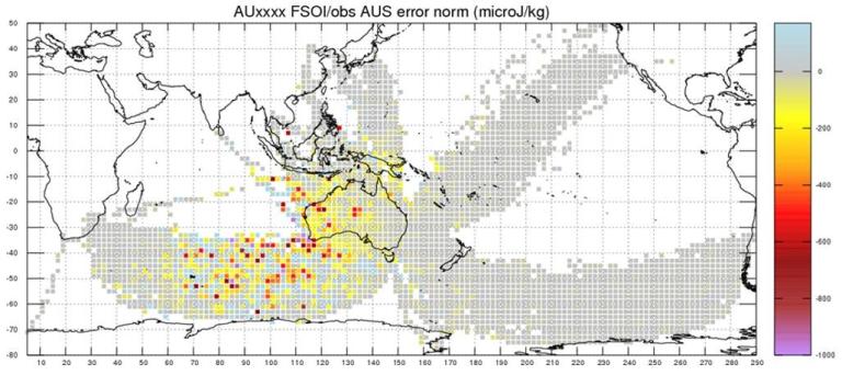 Per the author, “FSO impacts aggregated into 2x2 degree boxes to produce a spatial map of impact/observation for the same period in which the Bureau received the Air Nuigini data. Yellow > red > purple represent beneficial (negative) impacts; grey is neutral (zero) impact. No surprises: flights "upstream" (in the weather sense) of the Australian region have the most impact, and, as we might expect, flights over the eastern states, and over most of the Pacific, are neutral.”