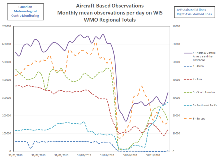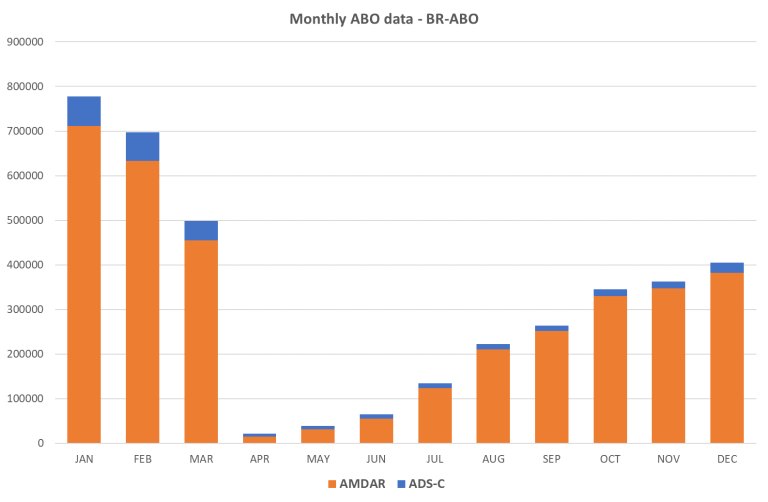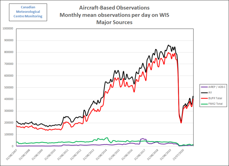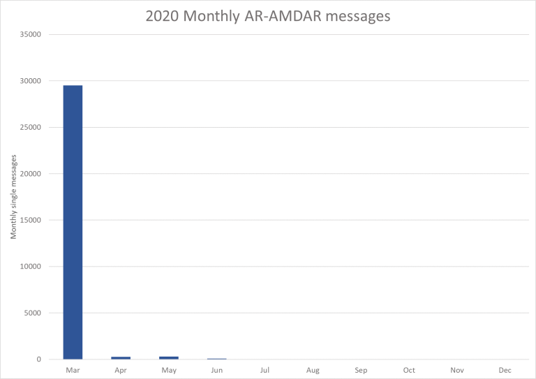 From March 2020 as a direct result of the impact of the COVID-19 impact on the aviation industry and airlines the volume of aircraft-based observations overall fell to around 245K observations per day and to 230K for AMDAR  - around 30% of December data volumes for both.