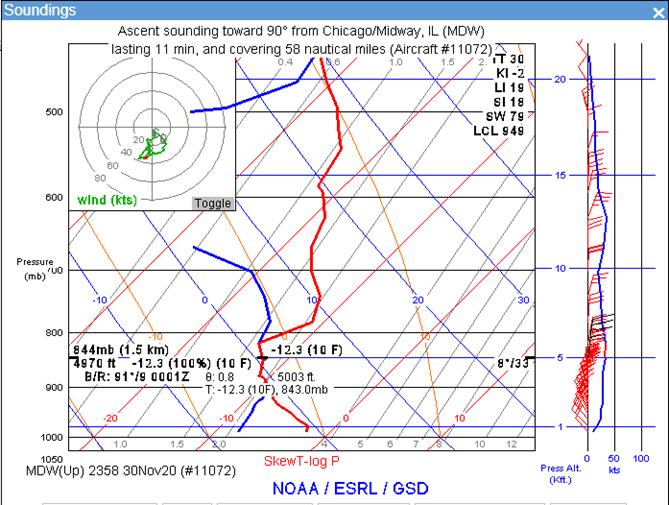 Meteorology: The relatively deeper -8° to -13.5°C lake effect clouds over and adjacent to Lake Michigan (as shown in the AMDAR sounding from nearby Chicago Midway Airport) meant that aircraft arriving on West Flow would be in the layer of supercooled cloud droplets for as long as 10 to 15 minutes.  While icing conditions are often most problematic in areas of large supercooled drops with temperatures warmer than -15°C, as was the case here, such a long duration in this layer also proved to be conducive to severe icing.