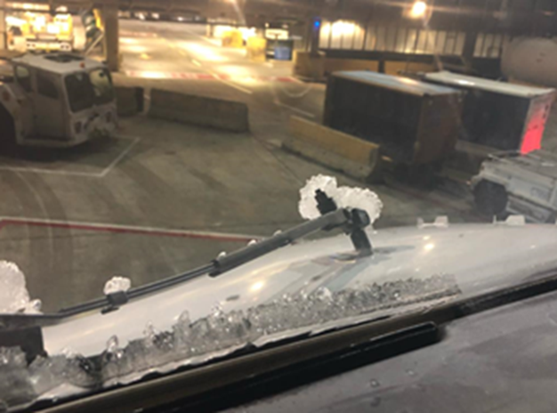 Significant impacts also were felt by airport operations on the ground including United Airlines (UAL). Because air temperatures at the surface dropped below freezing, ice on the arriving aircraft did not melt and required de-icing before those planes were able to depart on subsequent flight segments.  According to Mike Fox (UAL Managing Director Station Operations Center - ORD), the severity of the icing required as much as two to four times the typical de-icing fluid required for inbound aircraft.  The image shows significant buildup of mixed ice (both rime and clear ice) on the windshield of a UAL plane, while surface conditions were dry.