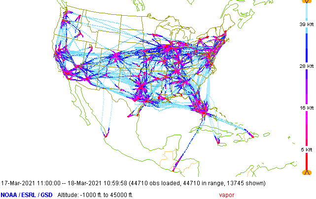 Similar to other ABO data, TAMDAR has been impacted significantly by COVID-19.  Although numbers are beginning to rebound, the TAMDAR sounding counts are roughly a quarter of pre-COVID-19 totals and the number of daily reporting aircraft is roughly a third lower compared to pre-pandemic levels. The image below shows where TAMDAR observations were collected for a one-week period in early March of 2021.