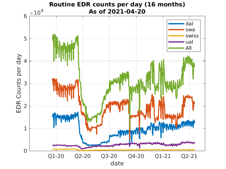 Figure 1:  Counts of all available routine EDR reports per day for the previous 16 months, as of March 20, 2021, broken out by reporting airline.