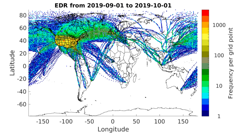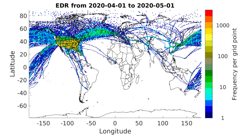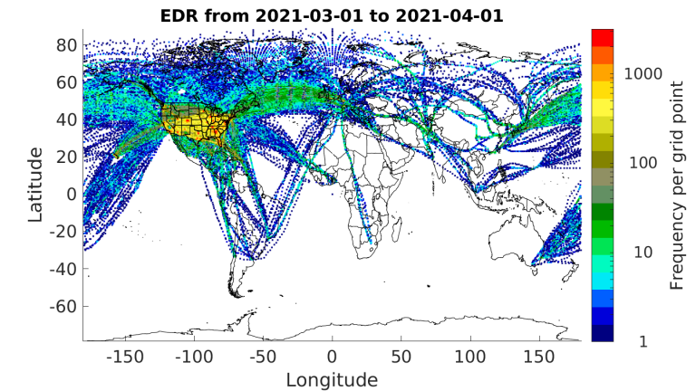 Before the COVID-19 pandemic, more than 1300 aircraft were reporting EDR worldwide with an average of approximately 80,000 reports per day as of February 2020.  However, as seen in Figure 1 which shows the approximate numbers of available routine EDR reports, beginning in March, a swift decline in the numbers of flights caused a drop in the EDR reporting to about 30% of pre-COVID-19 levels.  Since then, reporting has recovered slowly to about 85% of pre-pandemic levels.  Figures 2, 3, and 4 show the locations of available  EDR reports for September 2019 (before COVID-19), April 2020 (during the decline in reporting), and March 2021 (the most recent month) respectively.  Currently, more than 1300 aircraft are reporting EDR worldwide with an average of approximately 75,000 reports per day.  Since the number of reporting aircraft is now about the same as before the pandemic began, the lower reporting levels is likely due to an overall decrease in the number of flight hours.
