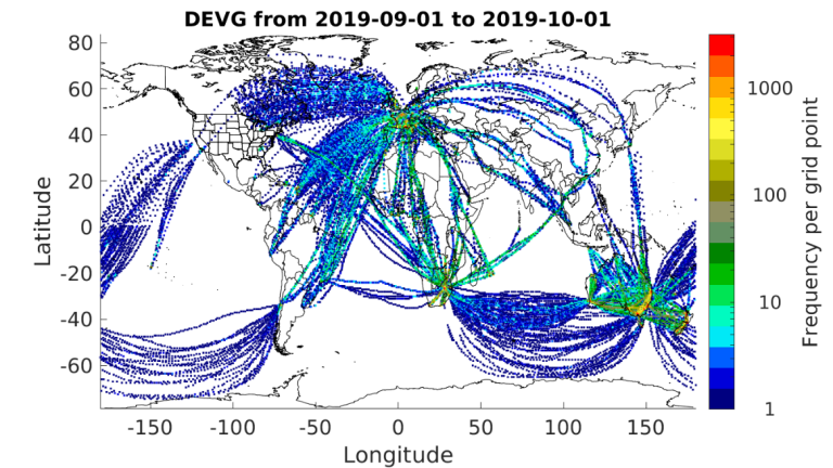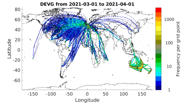 Figures 5, 6, and 7 show the locations of all DEVG reports for September 2019, April 2020 and March 2021, respectively.  There is software-based logic implemented on many aircraft that limit reporting of DEVG in some regions at certain altitudes (e.g., Europe).  DEVG reporting has grown over North America but has dropped precipitously over the southern hemisphere.