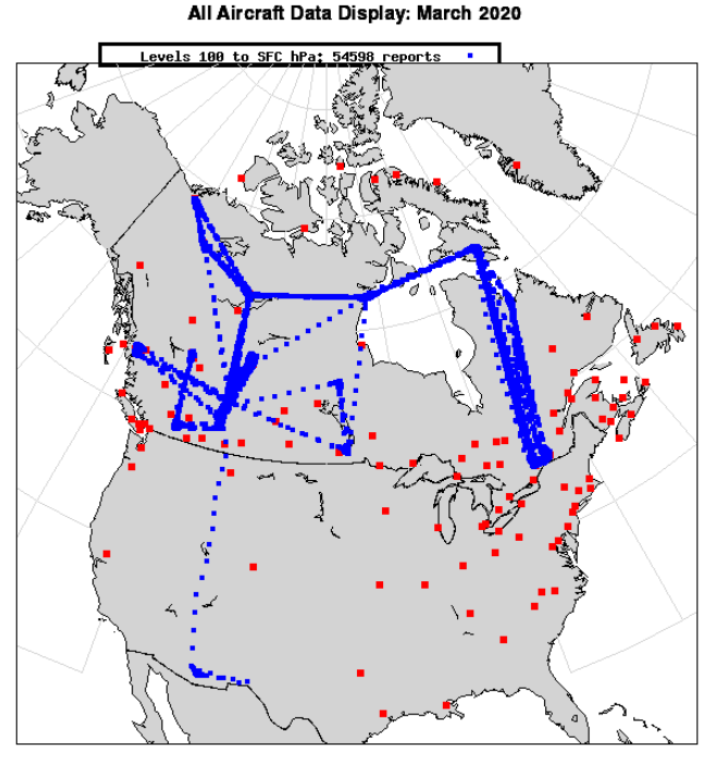 Figure 1:  Geographical coverage of FLYHT aircraft-based observations decoded by Environment and Climate Change Canada (ECCC) during March 2020.