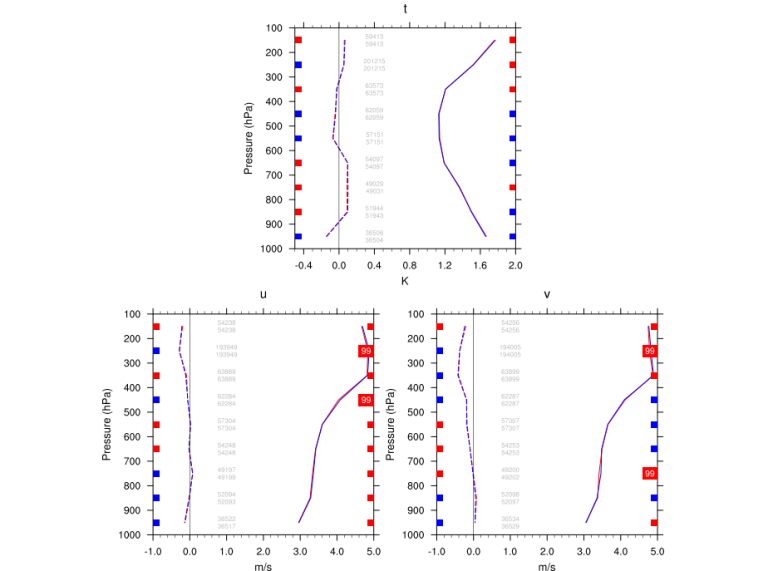 An assessment of the results at the 48-hr forecast lead time for individual variables at different vertical levels also was conducted (figure 3) against operational aircraft wind and temperature observations over North America for the 120 cases.  Improvements of the RMSE score are statistically significant for winds at a few vertical levels.  No statistically significant improvements were noticed for temperature.