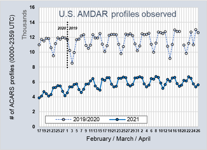 The larger U.S. network of WVSS-II-equipped B757 and B737 aircraft has been able to minimize the impacts resulting from COVID-19, operating at approximately 50% to 90% of 2019 levels during much of the pandemic.  This has been made possible through active collaboration between the U.S. WVSS-II data service provider, Collins Aerospace, and the participating airline partners, UPS and Southwest Airlines.  This collaboration has yielded the maximum possible availability of data from the three types of WVSS-II-equipped aircraft thereby minimizing the overall impact to ABO operations during the pandemic.