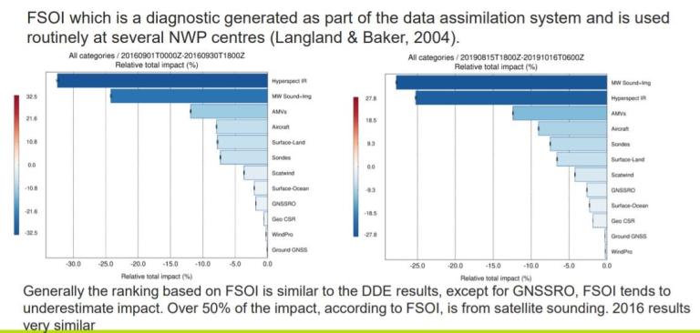 This study revisited the impact of all the main observation categories through a series of dedicated Data Denial Experiments (DDEs) and ranked the categories in terms of mean scorecard results, and provided an indication of relative impacts from the FSOI metric.  The revisit is relative to 2016 results and meant to capture changes that have occurred since that time in the configuration of the overall observing system and Met Office data assimilation and modeling.  DDEs were DDEs were run over three-month period: 15th August 2019-15th November 2019.  The following figure summarizes the FSOI results:
